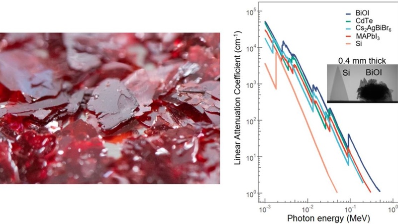 Stable, green BiOI single crystals for X-ray detectors capable of detecting X-ray dose rates over 250 times lower than the current best performing detectors used commercially. The very high linear attenuation coefficients are shown in right hand image. https://doi.org/10.1038/s41467-023-38008-4. A press release on the work, so far, is here: https://www.cam.ac.uk/research/news/sustainable-solar-cell-material-shown-to-be-highly-promising-for-medical-imaging