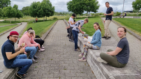 Following the recent German social events theme, members of Judith's and Giuliana's groups joined for a 'Weißwurstfrühstück', a Bavarian-themed breakfast with white sausages and weissbeer. (We don't even have Bavarians in the group, but hey ...) Group members came by at different times, as their lab schedules allowed, so not everyone is in the picture. So afterwards: Everyone back to the lab!